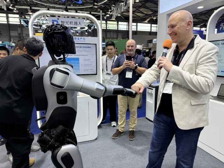 外国观众与人形机器人互动